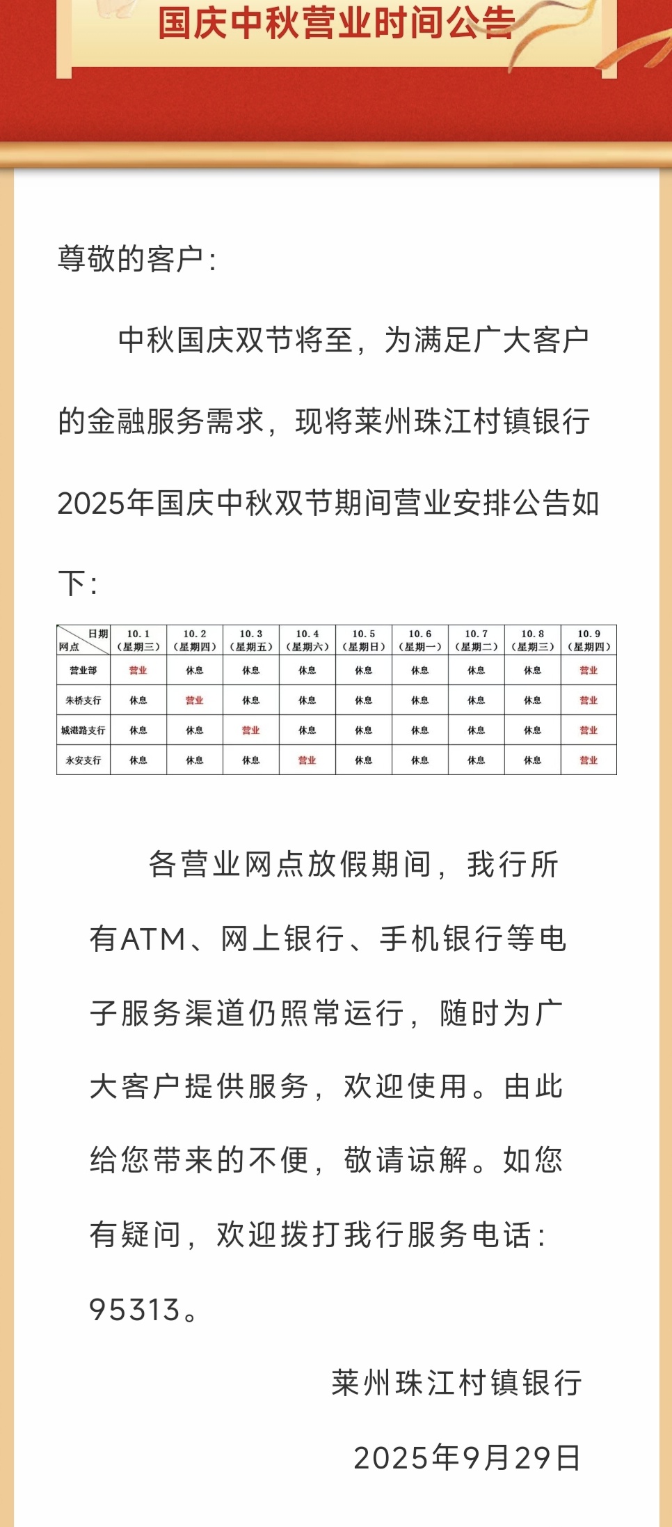 国庆中秋营业时间公告