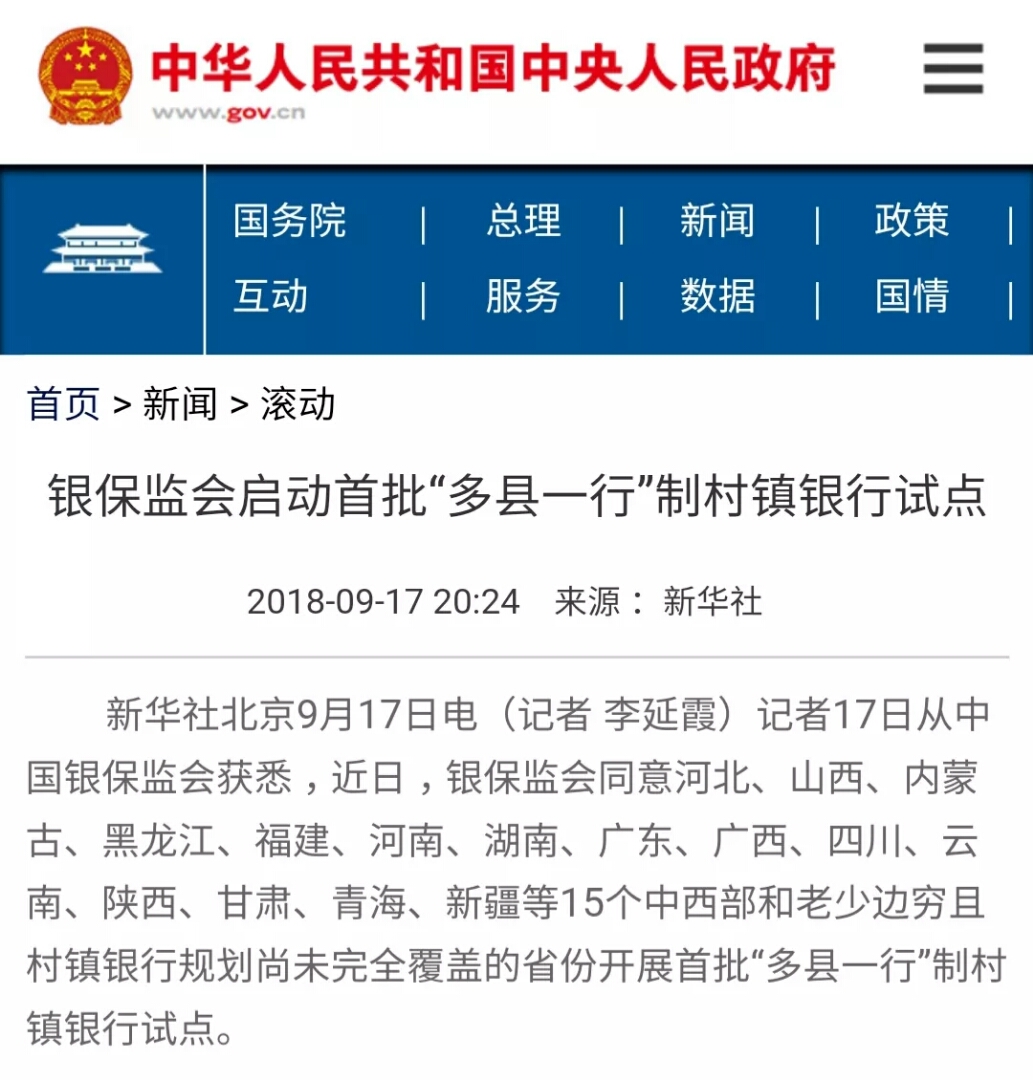 为贯彻落实党中央国务院关于建设普惠金融体系、推进金融精准扶贫和实施乡村振兴战略的决策部署,经国务院批准,近日,银保监会同意在全国15个中西部和老少边穷且村镇银行规划尚未完全覆盖的省份开展首批"多县一行"制村镇银行试点。