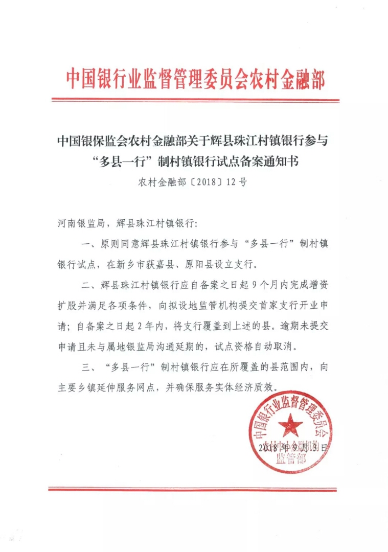 银保监会公布“多县一行”首批试点,辉县珠江村镇银行榜上有名